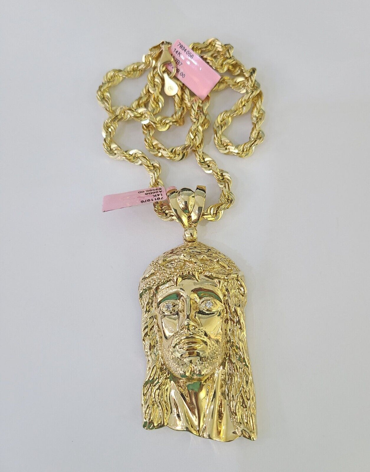 Real 14k Solid Rope Chain Jesus Head Charm Set 6mm 18"-30" Necklace Gold