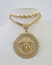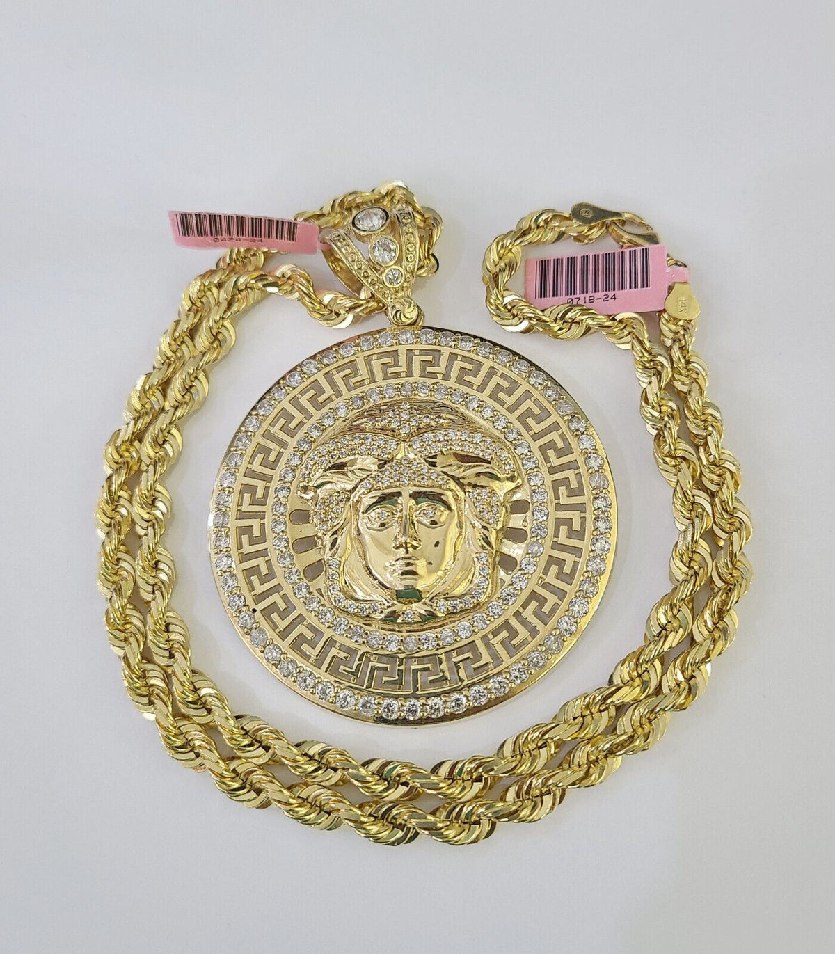 Is Presenting You with This Absolutely Stunning Real 14k Yellow Gold Solid Rope Chain 6mm, 18 inch-30 inches, Lobster Lock with a 14k Medusa Head Pendant. These Beautiful chains and Pendant will not tarnish, discolor, or fade because they are Pure 14K Gold. We also have them in various another length and sizes. 22"-A57B7 A25B6